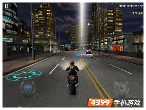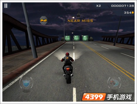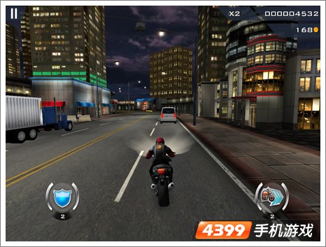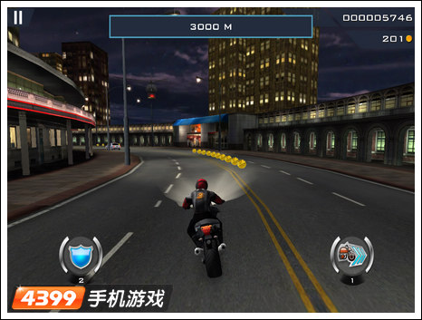 在驾驶摩托车的过程中,你需要利用重力感应控制方向,引导车子收集金币和躲避各种来自四面八方的突袭。你可以点击游戏屏幕的护盾,让你无坚不摧,享受一时安逸。也可以使用加速,瞬间进入风驰电掣的世界,甩开恼人的追击者。但值得说明的是,由于玩家操控的是摩托车,所以没有汽车那样来的稳定,尤其在过弯的时候你会感觉有点飘,玩家需要对车子做出及时的调整,特别在吃到加速道具的时候,稳住你的双手吧,左摇右摆的话是没有办法开的更远的。