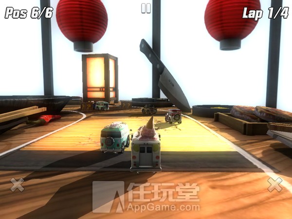 首先要说的就是游戏精美的画面,每个赛道都坐落在一个独特的桌面上,桌面上的各种摆设刻画地非常细致,整个画面的色调十分柔和,看上去非常舒服。在驾驶赛车的时候,每当桌面上各种精致的小物件闯入视线,你都会忍俊不禁,感叹开发者的细致用心。下面为大家贴上几张日式铁板烧餐桌赛道的精彩截图供大家欣赏。