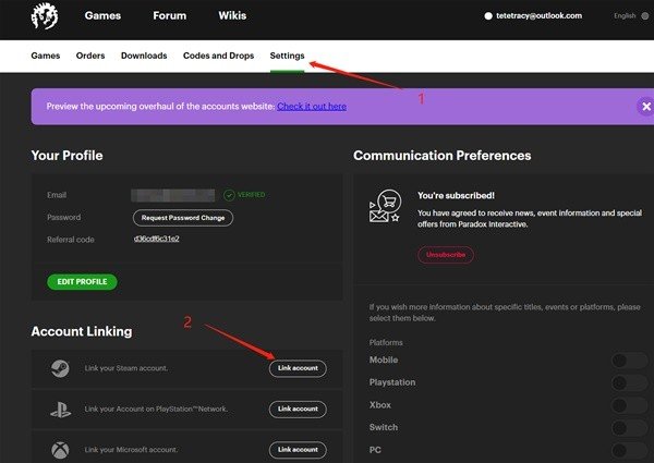 进入P社官网-选择settings-选择link account即可,没有P社账号的朋友往下看注册教程哦~